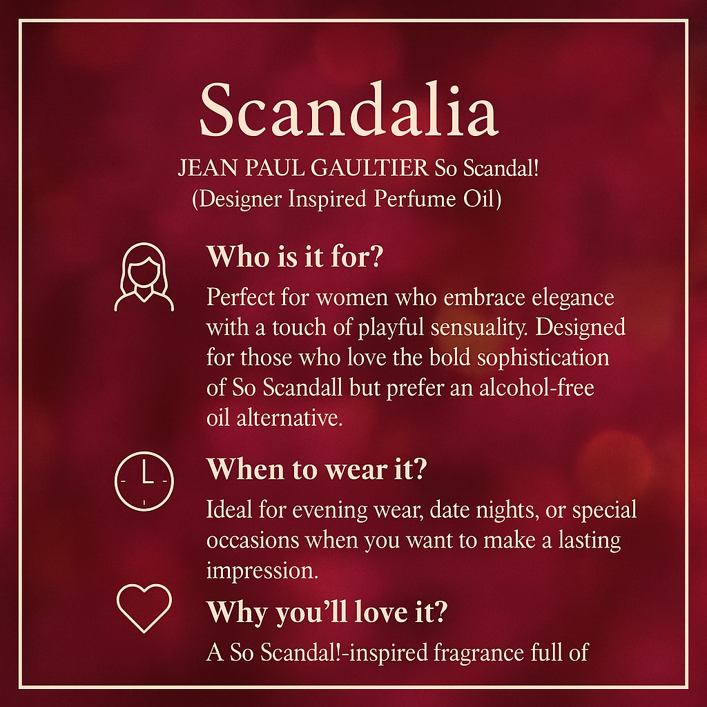 Scandalia is a Jean Paul Gaultier So Scandal!-inspired perfume oil that turns heads with its bold femininity and sensual charm. It opens with juicy raspberry and sweet orange blossom for an irresistible fruity-floral burst. The heart reveals an opulent bouquet of creamy tuberose and jasmine, while the base settles into a smooth milky accord, leaving behind a sensual and unforgettable trail.