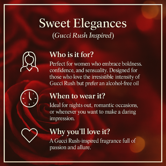 Sweet Elegances is a Gucci Rush-inspired perfume oil that unleashes bold passion and electrifying charm. It opens with an energetic rush of peach, gardenia, and freesia, setting a fruity-floral tone. At its heart, jasmine, Turkish rose, and coriander create sensual warmth and intensity. The base lingers with patchouli, vanilla, and vetiver, leaving behind a deep, alluring trail that captivates the senses.