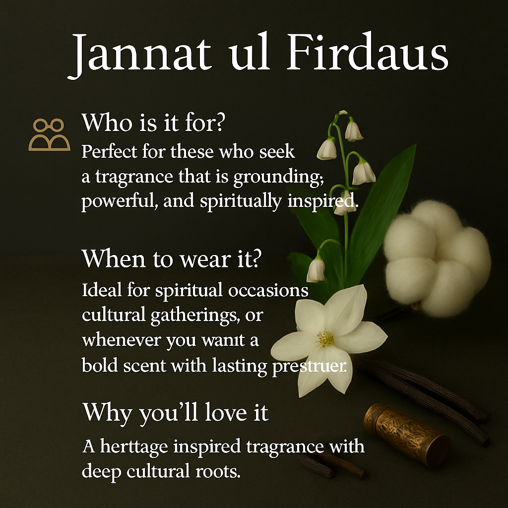 Let Jannat ul Firdaus transport you to a paradise of scent — rich, grounding, and unforgettable.