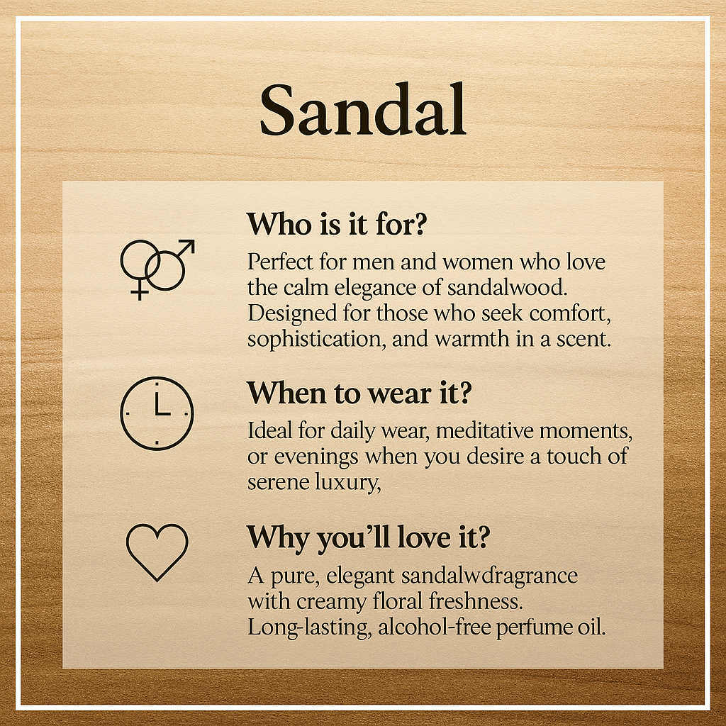 Perfect for men and women who love the calm elegance of sandalwood. Designed for those who seek comfort, sophistication, and warmth in a scent.