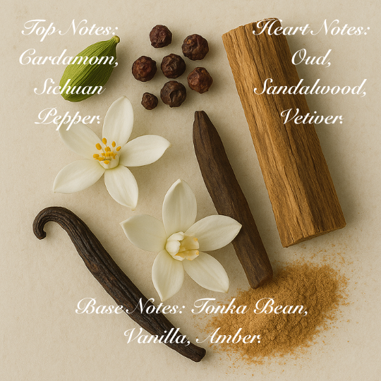 Heart Notes: Oud, Sandalwood, Vetiver.